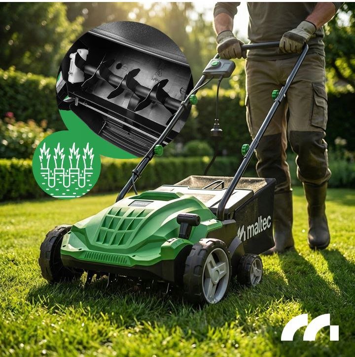 Prezentowany aerator to praktyczne rozwiązanie do kompleksowej pielęgnacji trawnika – pomaga poprawić jego strukturę, kondycję oraz ułatwia regularne prace sezonowe.