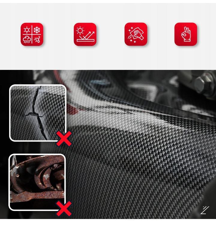 - Mniejsze nagrzewanie się powierzchni – specjalna struktura i barwa powłoki carbon ograniczają nagrzewanie się obudowy na słońcu, co poprawia komfort użytkowania w upalne dni i zmniejsza ryzyko odkształceń materiału.