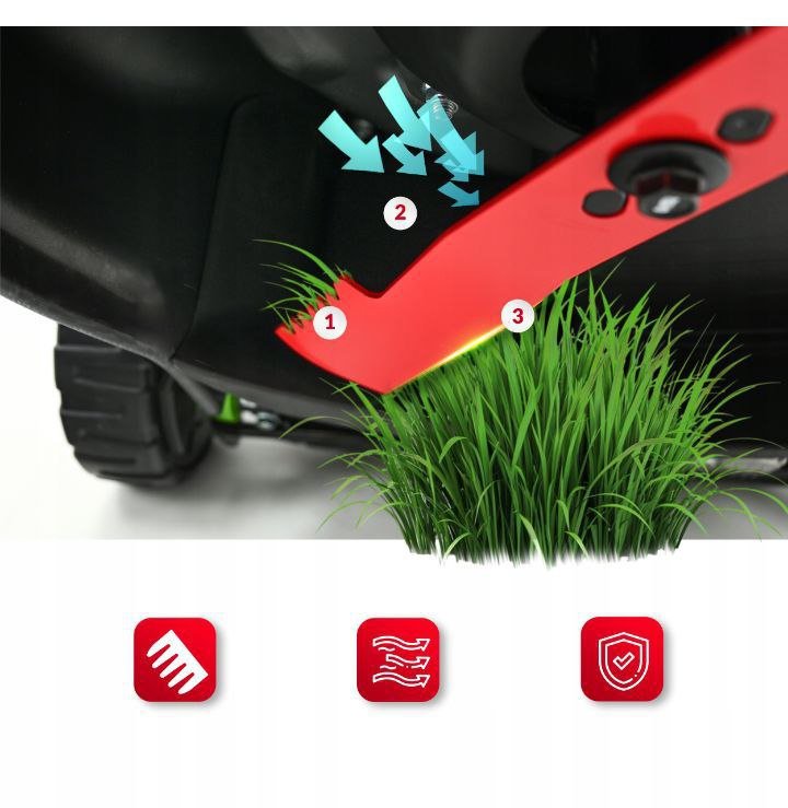 - Lepsza aerodynamika ostrza RED-CUT – poprawia cyrkulację powietrza pod obudową, co przekłada się na skuteczniejsze zbieranie trawy do kosza lub rozrzucanie jej podczas mulczowania pod kosiarką.