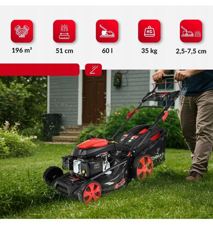 - Potężny silnik 196 cm3 – Zapewnia niezawodną moc, dzięki której kosiarka poradzi sobie nawet z gęstą i wysoką trawą, oszczędzając Twój czas i wysiłek.